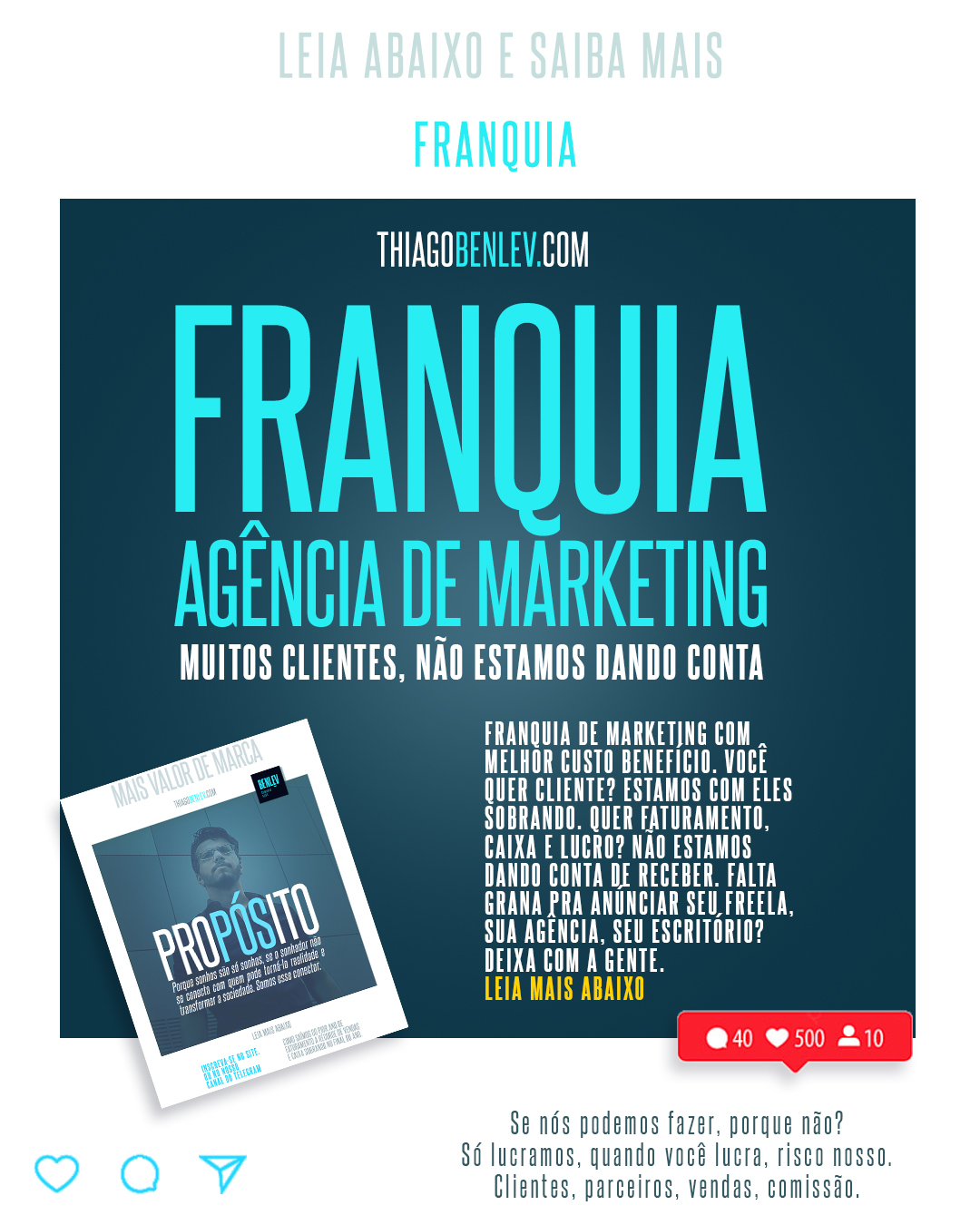 Além de receber clientes que dêem valor aos seus resultados, você ainda tem um modelo de negócios que pode atrair colaboradores de alta performance com boa lucratividade para você e seu time. Além de treinamento gratuito, workshops e mentorias oferecidas por nós além, é claro de espaço para aparecer em nossas redes sociais e se tornar mais conhecido e conhecida fazendo também o seu nome no mercado. Você ganha dinheiro e aprende mais sobre Marketing, Gestão e sobre como construir um império no seu negócio.