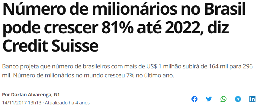 Segundo estudos do credit suisse, na América Latina o País que registrará maior crescimento em número de Milionparios é a Argentina. Chegará em 68 Mil daqui a cinco anos, o número é bom se comparado com os 30 mil registrados em 2017.
