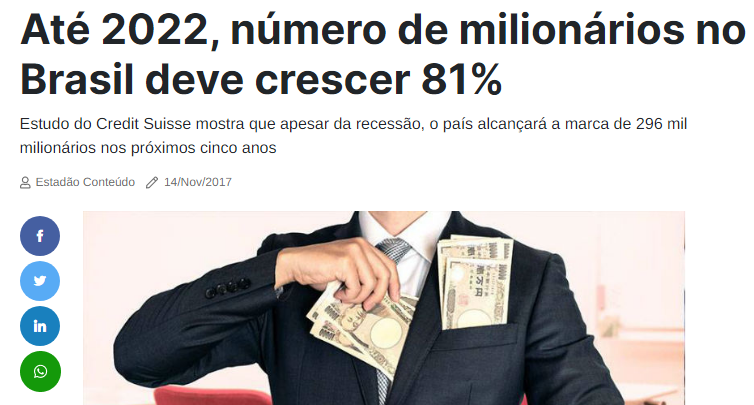 Segundo o Diário do comércio os números são favoráveis. Só no Brasil, o crescimento de número de milionários vai crescer em 81%. Isso é bom para economia e excelente para os novos empregos que esses trabalhos geram.